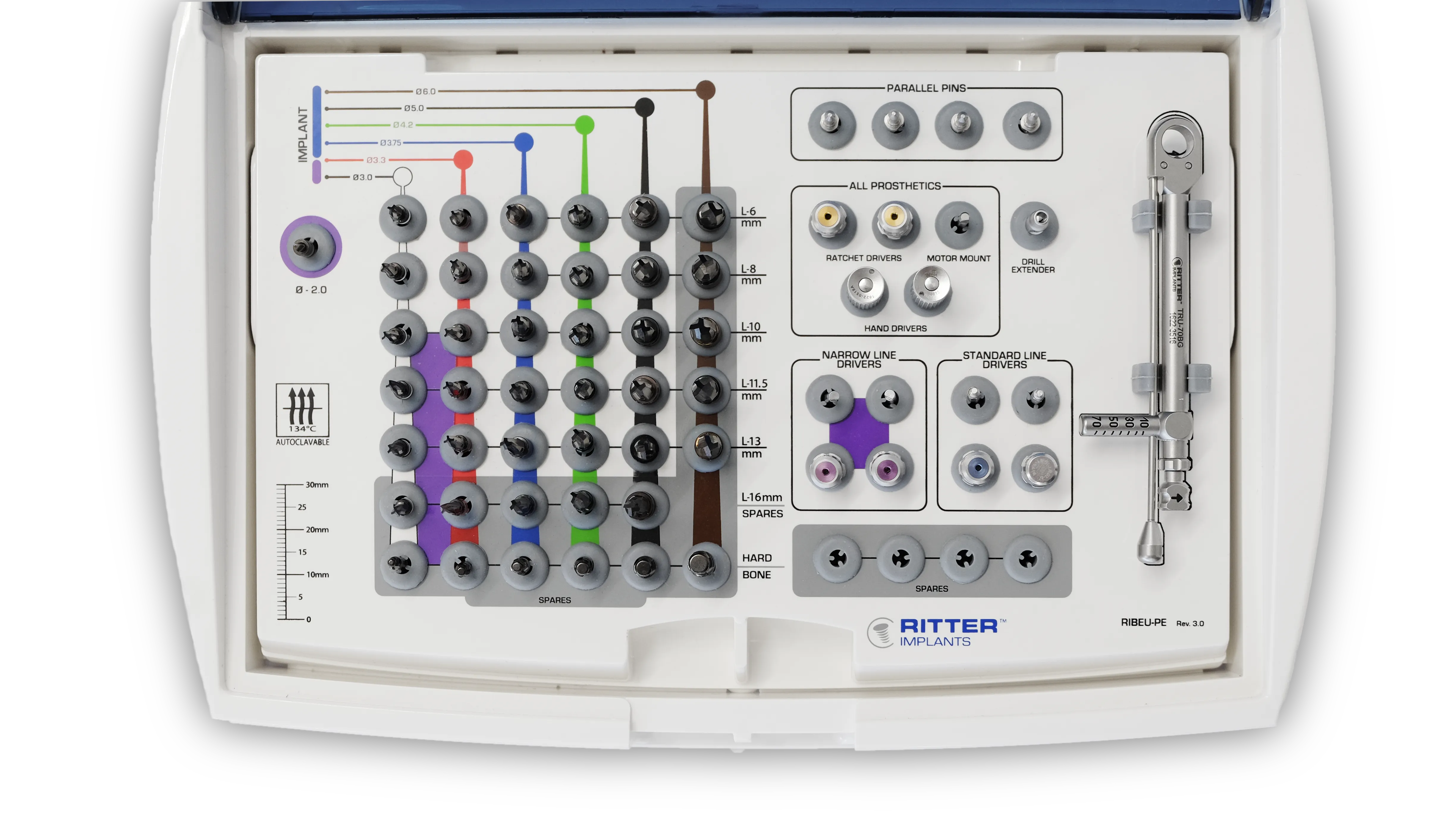 Tüm Ritter Implants Cerrahi Kitleri, ayrıca bir Protez Kitine ihtiyaç duyulmasına gerek bırakmayan, Protez Kitlerinde de yer alan ve protezin tamamlanması için gereken anahtarları ve raşeti içerir.