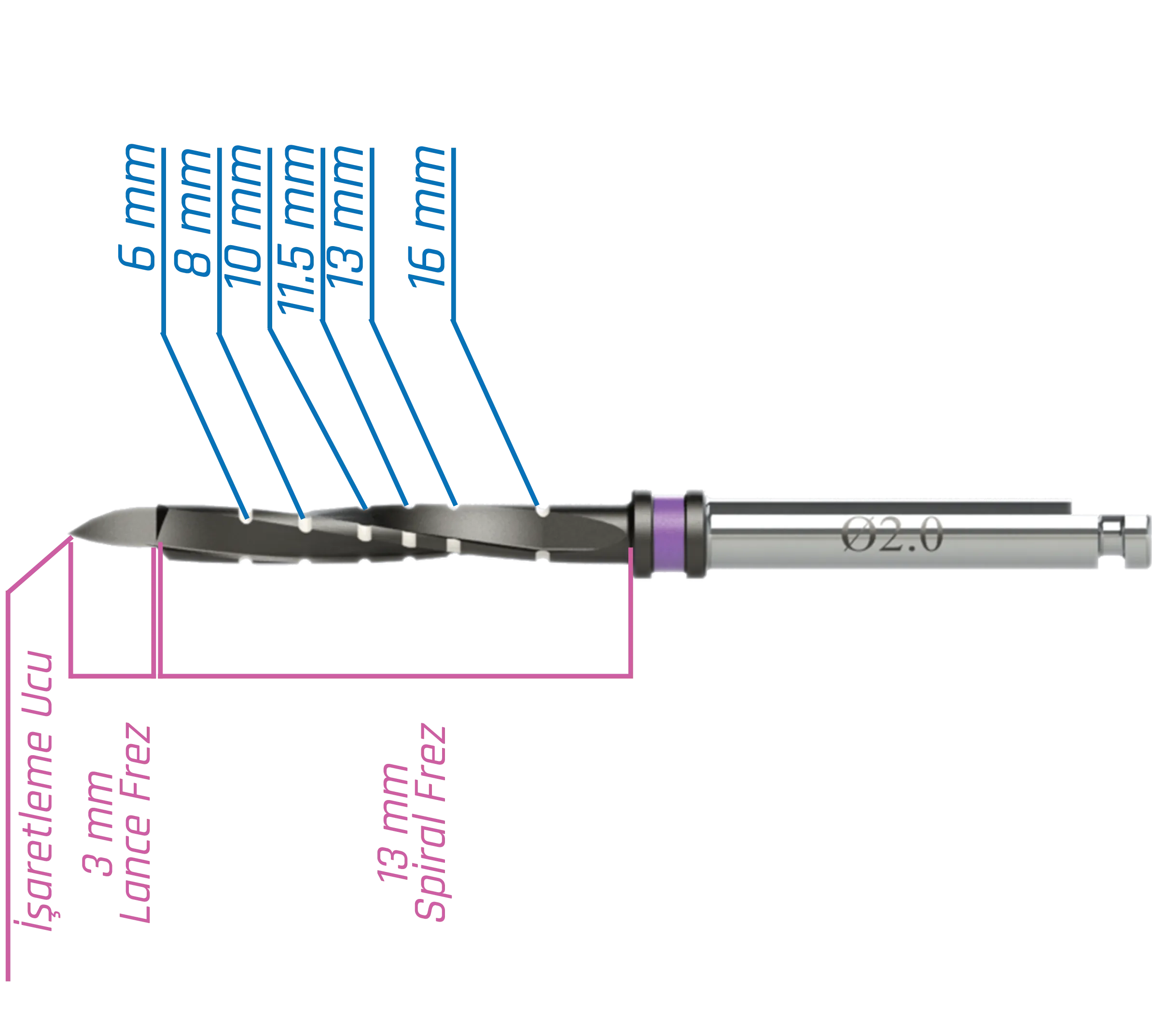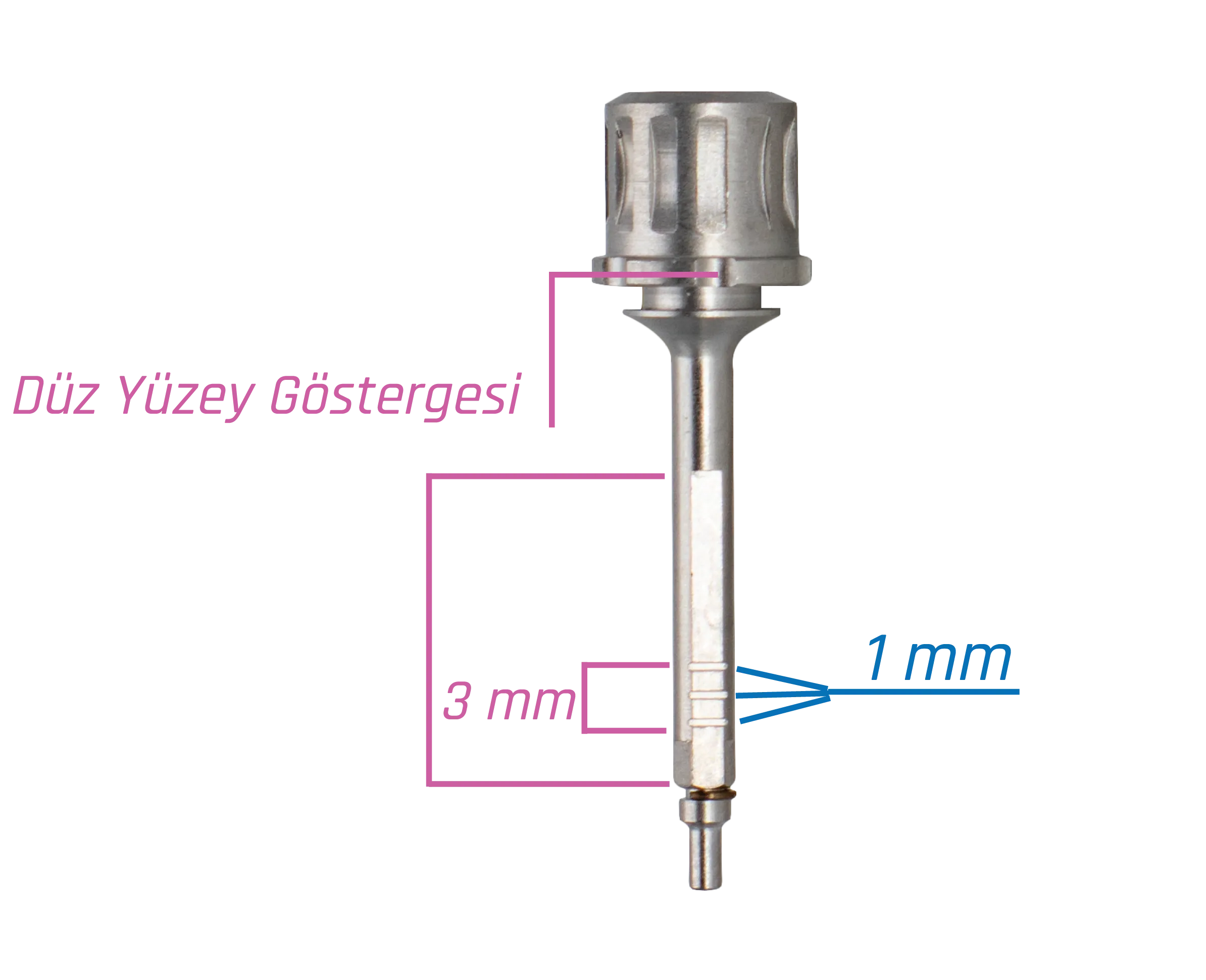 Complete Cerrahi Kit'teki implant anahtarlarında, ölçüm yapmayı kolaylaştıran işaretlemeler bulunur.