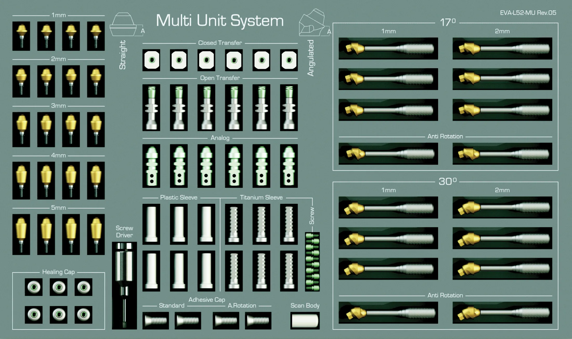 Multi Unit Kitleri: Karmaşık bir prosedürü çok daha kolay hale getiren 36 Multi Abutment, ara parçalar ve Multi protez başlıkları ile birlikte sunulmaktadır!